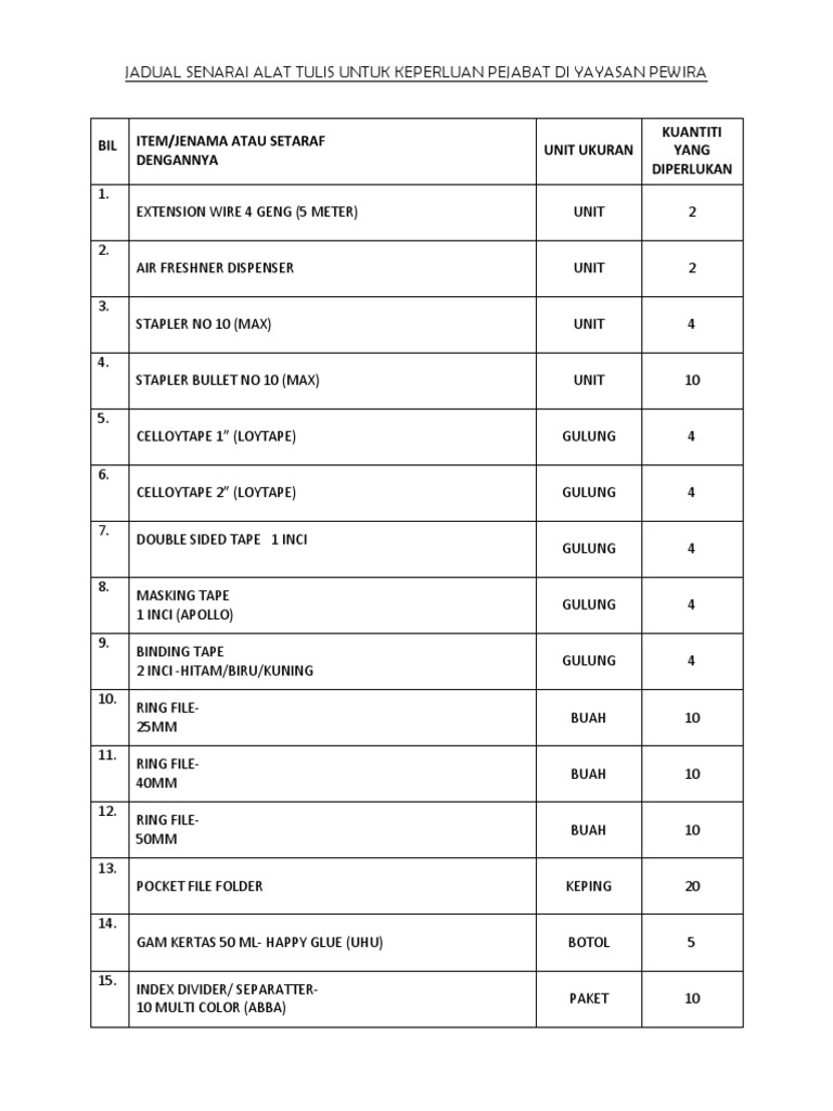 Jadual Senarai Alat Tulis Untuk Keperluan Pejabat Di Yayasan Pewira Pdf